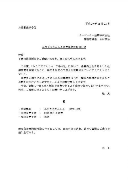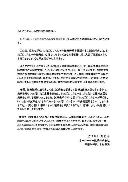 OGK技研株式会社ホームページ:ふたごじてんしゃ発売延期のお詫びとお知らせ