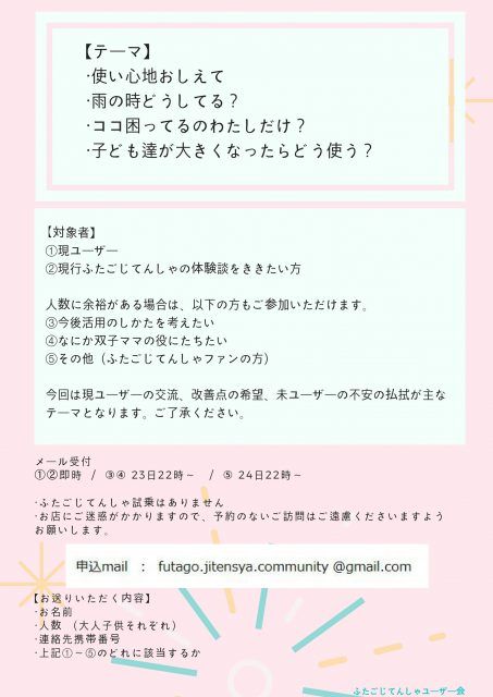 この度ふたごじてんしゃユーザー同士の交流、購入予定の方の疑問点の払拭を目的とし、ファンミーティングを開催することといたしました。