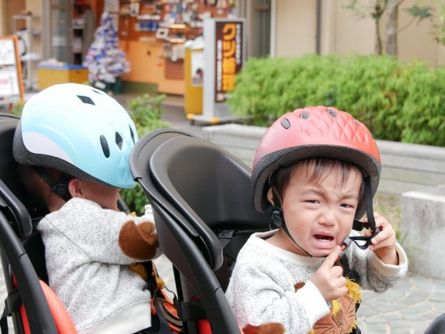 はじめてのヘルメット。とってもイヤダーって泣いちゃいました。