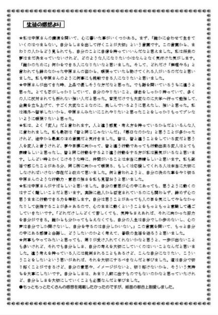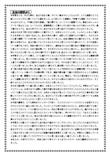 『どうしても周囲に合わせて自分を押し殺してしまうことがあるけれど、自分が感じたことを大切にし、それを臆することなく言葉にして、これからの人生を歩んでいってほしい、すると人生は楽しいし開けていくから。』